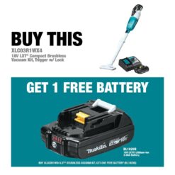 The Makita 18V LXT Brushless Cordless Vacuum Kit, model c, is a compact and powerful cordless vacuum with strong suction for fast and efficient cleaning. The vacuum can be used with trigger mode or slide switch mode for ease and convenience. Compact and ergonomic design for operator comfort and, at 2.7 lbs., is lightweight for reduced operator fatigue. A bagless cloth filtration system allows for easier cleaning and quicker debris disposal. The vacuum and included nozzle and attachment feature the distinctive teal and white trade dress. The XLC03R1WX4 is a kit and includes 1 fast-charging 18V LXT 2.0 Ah lithium-ion battery and efficient Rapid Optimum Charger. The powerful Makita-built motor delivers up to 49 CFM. Its part of Makita’s expanding 18V LXT system, the worlds largest cordless tool system powered by 18V lithium-ion batteries. Makita 18V Lithium-Ion Batteries have the fastest charge times in their categories, so they spend more time working and less time sitting on the charger. For improved tool performance and extended battery life, Makita created Star Protection Computer Controls. Star Protection is communication technology that allows the Star Protection-equipped tool and battery to exchange data in real time and monitor conditions during use to protect against overloading, over-discharging and overheating.