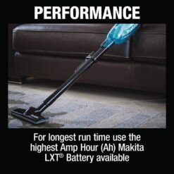 The Makita 18V LXT Brushless Cordless Vacuum (XLC09) is a compact and powerful cordless vacuum with strong suction for fast and efficient cleaning. It features two times more suction power for faster cleaning*.The XLC09 features a push button 4-speed power selection (max/high/normal/quiet) for efficient operation. It features up to 23 minutes of continuous use in quiet mode from a single fully charged 18V 2.0Ah LXT battery. The Makita-built brushless motor runs cooler and more efficiently; delivering up to 125 Watts of power.Convenience features include a compact and ergonomic design that reduces operator fatigue and a thermoplastic hand grip for longer life and a more comfortable feel. It also features a bagless cloth filtration system that allows for easier cleaning and quicker debris disposal, as well as increased storage capacity for longer time between waste disposal. It weighs only 2.9 lbs. with battery for reduced operator fatigue.It’s part of Makita’s expanding 18V LXT system, the world’s largest cordless tool system powered by 18V lithium-ion slide-style batteries. Makita 18V Lithium-Ion batteries have the fastest charge times in their categories, so they spend more time working and less time sitting on the charger.*Compared to XLC04