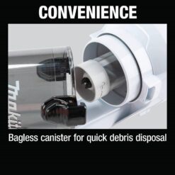 18V LXT Compact Brushless Cordless Cyclonic 4-Speed Stick Vacuum (XLC11) is a compact and powerful cordless vacuum with strong suction for fast and efficient cleaning.The XLC11 features powerful cyclonic action that separates dust particles for six times longer filter life. It features over two times more suction power with 35 CFM and 72″ static water lift*. It is engineered with 4-speed options for power and run time management. It also features low operating sound levels of 66 dB(A) on High Setting and 55 dB(A) on Quiet Setting.Convenience features include a compact and ergonomic design that reduces operator fatigue and a thermoplastic hand grip for longer life and a more comfortable feel. It also features a bagless cloth filtration system that allows for easier cleaning and quicker debris disposal, as well as increased storage capacity for longer time between waste disposal. The Stick Vacuum also features an L.E.D. light for improved visibility that also functions as a low battery charge indicator.It’s part of Makita’s expanding 18V LXT system, the world’s largest cordless tool system powered by 18V lithium-ion slide-style batteries. Makita 18V Lithium-Ion batteries have the fastest charge times in their categories, so they spend more time working and less time sitting on the charger.