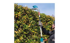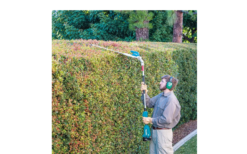 Makita is expanding the line of cordless outdoor power equipment with the 18V LXT Brushless Cordless 20 in. Articulating Pole Hedge Trimmer Kit (XNU01T). The 18V LXT Cordless 20″ Articulating Pole Hedge Trimmer is a welcome solution for professional hedge trimming because there are no pull starts, zero emissions, lower noise, and reduced maintenance. Enjoy up to 80 minutes of run time using a fully charged 18V LXT 5.0Ah Battery. Six angle settings offer 115-degrees of working range. The XNU01T is ideal for efficient trimming of overhead and low-lying hedges. The 20″ dual-action double-sided shear blade provides optimal performance. The BL Brushless Motor delivers up to 4,400 SPM for faster cutting. It has three speed options (2,000/3,600/4,400). The commercial-duty gear case is engineered for improved durability in daily professional use. Makita’s Extreme Protection Technology (XPT) is a protective seal inside the tool. It is designed to improve a tool’s operation in harsh conditions by channeling water and dust from key internal components.