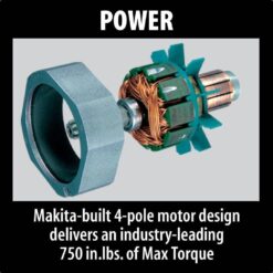 - Makita-built 4-pole motor delivers 750 in. lbs. of max torque; 25% more than the previous mode (compared to BHP454)