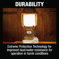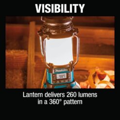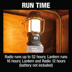 The 18V X2 LXT Lantern with Radio (XRM12) offers bright illumination with premium sound quality. The circular design of the lighting area provides 360° illumination, allowing the user to see in all directions with moving the light itself.The XRM12 delivers 260 lumens in a 360° pattern. The radio operates with a push button digital tuner that has nine programable stations for AM and FM radio. The Lantern runs for 16 hours, the Radio for up to 52 hours, and when operated at the same time, the Lantern and Radio can operate for up to 12 hours with a 18V LXT 5.0Ah battery (sold separately).Convenience features include a metal hang hook that is durable enough for the job site. The is also a strap that allows the Lantern to be hung upside down for more illumination angles. It only weighs 3.5 lbs with battery (battery and charger sold separately). The lens guard doubles as a FM antenna for enhanced sound quality.It’s part of Makita’s expanding 18V Lithium-Ion System, the world’s largest cordless tool system powered by 18V lithium-ion slide-style batteries. Makita 18V LXT Lithium-Ion Batteries have the fastest charge times in their categories, so they spend more time working and less time sitting on the charger.