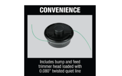 15 in. cutting swath for increased productivity - Includes bump and feed trimmer head loaded with 0.080 in. twisted quiet line