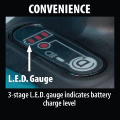 - 3-stage LED gauge indicates battery charge level