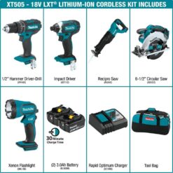 Makita XT505 18V LXT Lithium-Ion Cordless Combo Kit (5-Tool) with (2) 3.0 Ah Batteries, Rapid Charger and Tool Bag