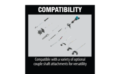Landscapers and contractors are demanding more cordless alternatives to gas-powered outdoor power equipment. Makita is meeting demand with an expanding line of cordless OPE that includes the 18-Volt X2 LXT Lithium-Ion (36-Volt) Brushless Cordless Couple Shaft Power Head. With zero emissions, lower noise and maximum versatility, the Power Head is a welcome solution for a range of trimming and cutting applications. Its powered by two 18-Volt LXT batteries for maximum performance and run time without the hassles of gas and without leaving the 18-Volt battery platform. The Power Head is compatible with a variety of optional couple shaft attachments, with a lever style lock system for quick tool-less installation and replacement. It can be used with multiple attachments for trimming, edging, cultivating, and brush cutting (sold separately). Note that kit XUX01M5PT includes string trimmer attachment. Makita’s efficient BL Brushless motor is electronically controlled to optimize battery energy use for up to 50% longer run time per battery charge than similar non-brushless tools. Electronic controls efficiently use battery energy to match the changing demands of the application for increased power and speed when needed. With no carbon brushes, the Makita BL Brushless motor runs cooler and more efficiently for longer life.