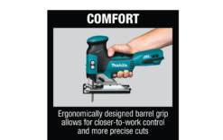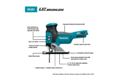 Makita is a leader in brushless motor technology and the Makita 18-Volt LXT lithium-ion Brushless Cordless Barrel Grip Jig Saw (model XVJ01Z, tool only, battery and charger sold separately) seamlessly combines precision and power with the efficiency of brushless. The XVJ01Z is engineered to deliver the power and performance of a corded jig saw without the hassles of a cord. It is ideal for professional woodworkers, cabinetry makers, specialized residential construction workers and any pro-contractor seeking a best-in-class cordless jig saw. The XVJ01Z features an ergonomically designed barrel grip, which is closer to the work surface for more precise cut. The brushless motor is engineered for efficiency, with a variable speed control dial (800-3,500 SPM) that enables users to match the speed to the application. Added features include 3 orbital settings plus straight cutting for faster and more accurate cuts in a variety of materials. Convenience features include a tool-less blade change system that allows for faster blade installation and removal and a large 2-finger variable speed trigger with lock-on button. The heavy-gauge aluminum base is engineered for smooth, accurate cutting and added durability and the dual LED lights illuminate the work area. It weighs only 5.5 lbs. with battery (sold separately).
