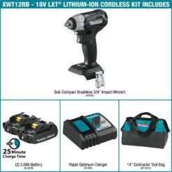 Makita created a new class in cordless with 18V LXT Sub-Compact tools. Makita Sub-Compact gives users 12V handling with 18V run time and compatibility with the world’s largest 18V lithium-ion cordless tool system. The 18V LXT Sub-Compact Brushless 3/8 in. Square Drive Impact Wrench is ideal for working in tight spaces and for overhead applications.The XWT12RB has an efficient Makita BL Brushless Motor engineered for up to 50% longer run time, increased power and speed, and longer tool life. It has variable two-speed with 0-1,300/0-2,400 RPM and 0-2,000/0-3,600 IPM and up to 130 ft.lbs.of Max Torque. The compact size and lower weight mean reduced fatigue for operators, especially for overhead applications. For added convenience, the Reverse Rotation Auto-Stop Mode stops rotation and impact when the fastener is loosened adequately. Users also get a variable speed trigger, built-in L.E.D. lights, and a convenient 3/8″ square drive for quick socket changes.It features Makita Extreme Protection Technology (XPT). XPT is a protective seal inside the tool, and is engineered for improved operation in harsh conditions by channeling water and dust from key internal components.It’s part of Makita’s expanding 18V LXT system, the world’s largest cordless tool system powered by 18V Lithium-Ion batteries. Makita 18V LXT batteries have the fastest charge times in their categories, so they spend more time working and less time sitting on the charger.