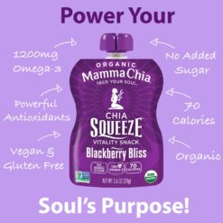 Mamma Chia Organic Vitality Squeeze Snack, Blackberry Bliss, 24- 3.05 Ounce Chia Pouches. USDA Organic, Non-GMO, Vegan, Gluten Free, and Kosher. Fruit and Vegetables with only 70 Calories