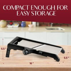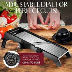 - Our ADJUSTABLE BLADE dial ends fumbling for accessories and storage headaches. No hunting through your kitchen junk drawer for your favorite blade! All slicing options are built-in on our device. Slice from paper thin to 9mm thick. Two julienne settings – 4.5mm and 9mm. Also makes WAFFLE FRIES or RUFFLED POTATO CHIPS. NO TOUCHING BLADE to change it out. Our cutter makes quick, healthy veggie based meals, potato chips or french fries FAST AND SAFE. Unit folds flat for easy storage in a drawer.