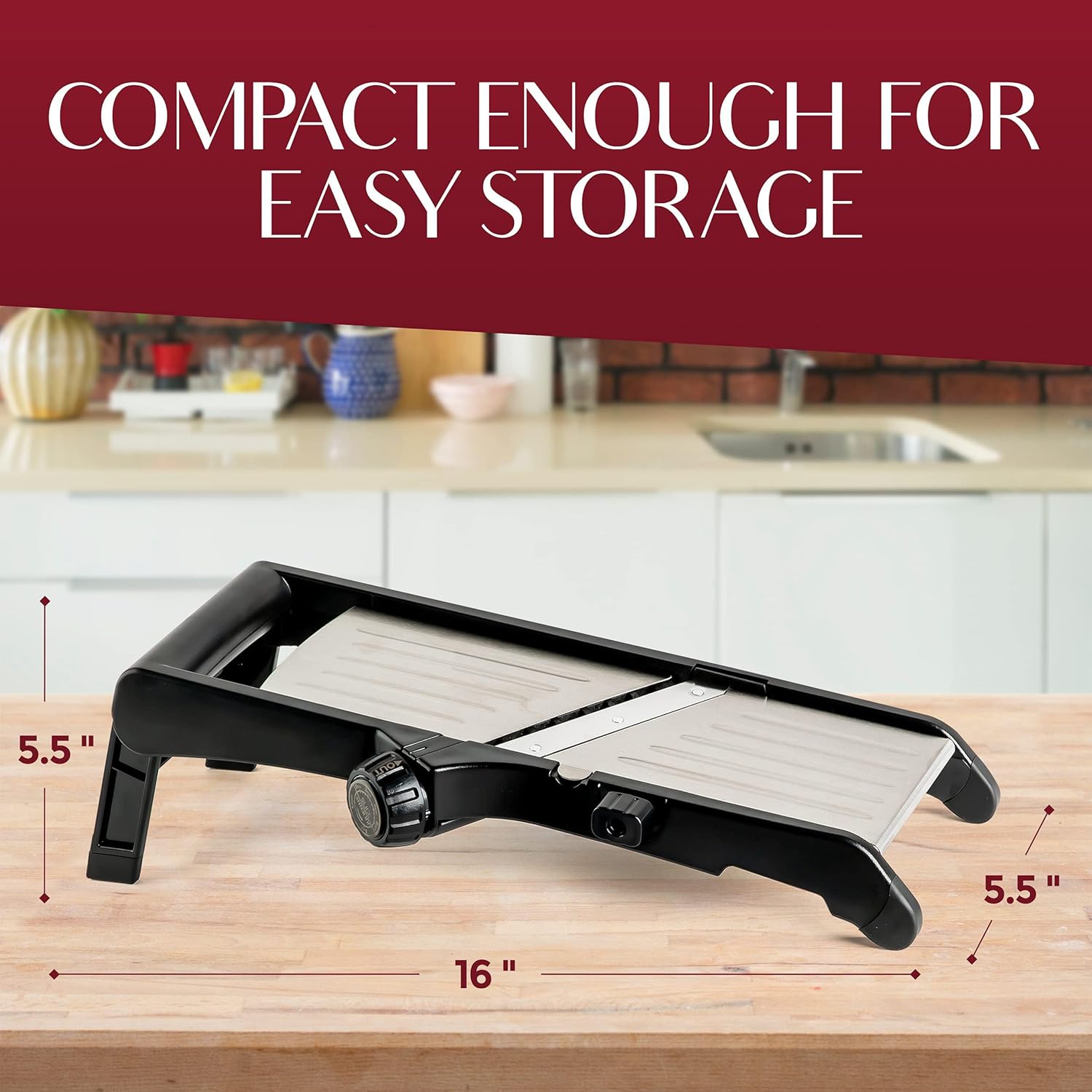 - WHAT MAKES US DIFFERENT: Our ADJUSTABLE BLADE DIAL ends fumbling for accessories and storage headaches. No hunting through your junk drawer for your favorite blade! All slicing options are built-in on our device. Slice from paper thin to 9mm thick. Two julienne settings, 4.5mm and 9mm. Also makes WAFFLE FRIES or RUFFLED CHIPS. NO TOUCHING BLADE to change it out. Our cutter makes quick, healthy veggie based meals, potato chips or french fries. Unit folds flat for easy storage in a drawer.
