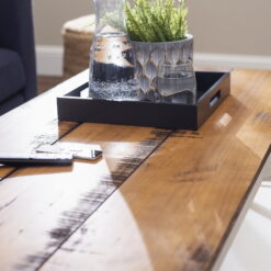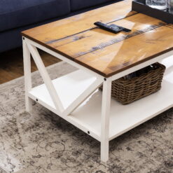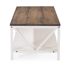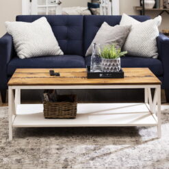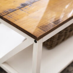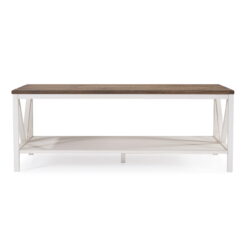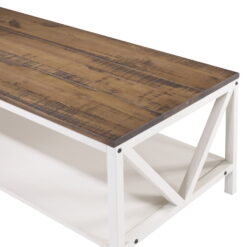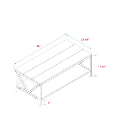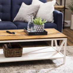 Complete that cozy home feeling with this 48″ two-tone farmhouse-style coffee table. This piece is ideal for both entertaining and everyday needs. Whether you use it as a cocktail table or a spot to serve after-school snacks, the distressed solid wood table top will impress you with its durability. The solid wood legs with a trestle-like detail also increase the stability and character of this wood accent table. And as a final touch, this rectangle coffee table also features a lower shelf made of high-grade MDF for storage.
