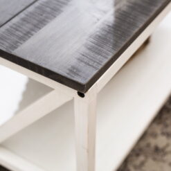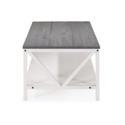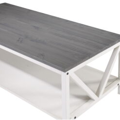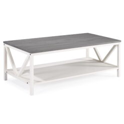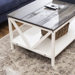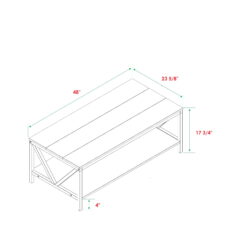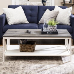 Complete that cozy home feeling with this 48″ two-tone farmhouse style coffee table. This piece is ideal for both entertaining and every day cares. Whether you use it as a cocktail table or a spot to serve after school snacks, the distressed solid wood table top will impress you with its durability. The solid wood legs with a trestle like detail also increase the stability and character of this wood accent table. And as a final touch, this rectangle coffee table also features a lower shelf made of high-grade MDF for storage.