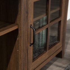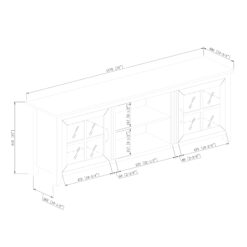 Display your decor, media, and more in style with this wood TV stand from Manor Park. With windowpane side cabinets featuring tempered safety glass for a classy addition to the mix of traditional and transitional design style. For a timeless addition to your home, this entertainment center includes both open and closed storage space. Center open shelving provide room for electronics, with cord management to keep wires looking tidy. Including adjustable shelving, this storage cabinet makes it simple to organize your essentials where you want them. As a TV stand in your living room to hold up to a 78-inch TV or as a buffet in your dining room for tablecloths, plates, and glassware.