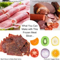 - 1. This Befen Frozen Food Slicer eliminates one of the most time-consuming jobs in food prep. It helps to slice frozen meat, such as frozen beef, lamb, chicken, ham and fish into uniformed thin slices for different cuisines including shabu shabu hotpot, stir fry, BBQ, sukiyaki, pizza topping, sandwiches or beef jerky for snack, without struggling with a butcher knife.
