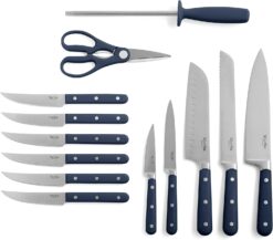 - WHAT’S IN THE BOX: One 8-inch chef’s knife, one 7-inch santoku knife, one 8-inch bread knife, one 5-inch utility knife, one 3.5-inch paring knife, six 4.5-inch steak knives, one pair of kitchen shears, one sharpening steel, and one acacia wood block