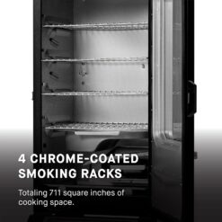 - SPACIOUS VERTICLE DESIGN with 711 cooking square inches that fits up to 6 chickens, 2 turkeys, 4 pork butts or 4 racks of ribs4 Chrome-coated smoking racks.