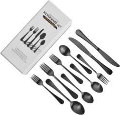- BLACK SILVERWARE SET FOR 8 – This 40 Piece heavy duty spoons and forks set includes 8 each of dinner knives , dinner forks , salad forks, dinner spoons, and teaspoons, well packing in a gift cardboard box.