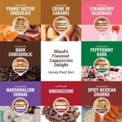 - [Flavorful Cappuccino Coffee Variety Pack]: Maud’s “Cappuccino Delights” pods feature high-quality, ethically sourced ingredients, honoring cherished coffee traditions. The assortment includes Creme De Caramel, Spicy Mexican Churro, Peppermint Bark, Strawberry Milkshake, Mochaccino, Dark Chocoholic, Peanut Butter Chocolate, and Marshmallow Sundae—capturing the essence of delightful cappuccino moments.