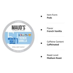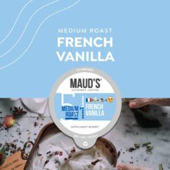 - [Flavorful French Vanilla Blend]: Maud’s French Vanilla Flavored Coffee Pods deliver a punch of zero-sugar sweetness with a medium roast flavored coffee blend that includes hints of vanilla and cream. The result is a smooth-bodied coffee with a sweet aroma and a buttery finish of vanilla flavor.