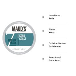 - [Flavorful Kona Coast Blend]: Maud’s “Kona Coast” coffee is a rich medium roast with a smooth, heavy body. This low-acidity coffee is roasted to a perfect dark brown bean and features delicious chocolate-nutty undertones.