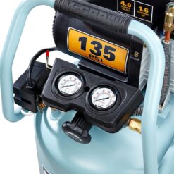 This vertical air compressor is ideal for intermittent air tool use, painting, nailing/stapling, and blow guns. Featuring a powerful 1.6 running HP induction motor with thermal overload protection, handle and console cover for added protection, large rubber tires and ergonomic handle for smooth portability. With rubber foot stabilizers for reduced vibration and conveniently located forward facing drain valve for fast, thorough tank draining.