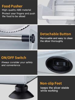 - [Safety Protection] Non-slip suction cup feet keep the deli slicer stable while working, and the food pusher also acts as a blade guard to help keep your fingers safe. The on/off switch provides added safety.