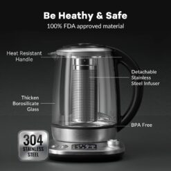 - No Shortcuts In Material – Your electric water kettle is made of 304 stainless steel, borosilicate glass, and BPA-free plastic. To guard against scaling and corrosion, wash regularly and empty after each use.