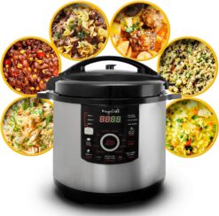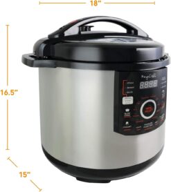The Megachef 12 Quart Steel Digital Pressure Cooker with 15 Presets and Glass Lid is sure to become your favorite kitchen sidekick! With this pressure cooker you have the option to cook using the slow cook function for up to 9.5 hours, making this electric cooker perfect for chilies and roasts. The included tempered glass lid allows you to monitor your meals hands-free without letting heat escape.