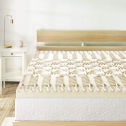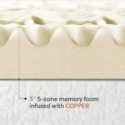 Best Price Mattress New 5-zone beige bed topper is a 3 Inch CertiPUR-US certified, premium memory foam mattress topper for maximum comfort and better sleep. Product features a 5 Body zone with different point of contact to better prevents tossing and turning. Its copper Infused memory foam layer with properties for enhanced Freshness