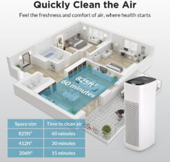 A CADR of 110CFM makes it ideal for home living rooms, bedrooms, offices, nurseries, and kitchens. It covers 825 square feet/77 square meters in 60 minutes and 413 square feet/35 square meters in 18 minutes.