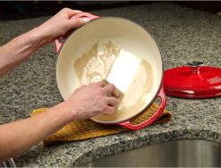 - EASY TO CLEAN: The enamel interior minimizes sticking and is resistant to chipping and staining. In order to keep your Dutch Oven in good condition wash by hand only with a soft sponge and mild soap, do not immerse in water for long periods of time