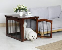 The 2-in-1 Configurable Pet Crate and Gate provides your dog with a secure resting area and also functions as an accent furniture piece. The crate includes a solid-wood veneer cover that complements your décor and allows you to use the top surface for placing personal items. This wooden pet crate turns into a gate and can be used to close off doorways and/or open spaces. Each panel is easily removable to accommodate smaller openings. A removable plastic tray is also included to protect your flooring.