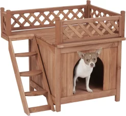 - Provides two comfortable areas for your pal―a sheltered lounge and a comfy veranda with latticework and steps.
