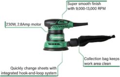 Metabo HPT 5-Inch Random Orbit Sander | Variable Speed | Powerful 230W 2.8 Amp Motor | Soft Elastomer Grip | Includes 2 Pieces of Sanding Paper, Dust Bag, Vacuum Adapter | 5-Year Warranty | SV13YST