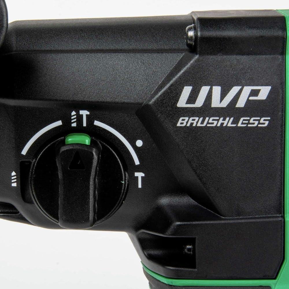 The 36V MultiVolt Brushless 1-1/8″ SDS Plus Rotary Hammer with UVP model – DH3628DAQ4 (tool body only) offers corded performance with the convenience and versatility of a cordless tool. GO all day with less fatigue as its reduced weight design and added User Vibration Protection (UVP) makes drilling easier. Work more efficiently with the auto stop feature that allows for set times when drilling repetitively. Control the power with its two-speed setting functions. Work safely as the Reactive Force Control (RFC) stops the motor before the entire tool jerks if the tool bit is suddenly overburdened during operation. Use the LED level with a built in sensor that will detect the tilt of the tool and indicate when straight for precising drilling. This results in less time and money being spent adjusting skewed anchor bolts or re-drilling anchors. Work cleaner and safer with the optional dust extractor (#379135M). The DH3628DAQ4 36V Brushless Cordless 1-1/8″ SDS Plus Rotary Hammer is part of the expanding MultiVolt system of power tools from Metabo HPT. It accepts any MulitVolt battery for extreme power and runtime and can also accept the unique AC Adapter (ET36A) to plug in for all day runtime, offering ultimate versatility and power on the GO. Also available kitted – model DH3628DA.