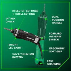 - PRECISION SCREWDRIVER SET FOR DIY WORK: The Metabo HPT electric screwdriver set offers 21 clutch settings + 1 drill setting for precision and control. In addition, this small screwdriver set has a built-in led light for safe and accurate work in dark environments.