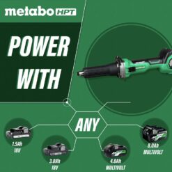 The 18V multi volt 18V cordless die grinder (GP18dad4) with slide switch provides the same grinding performance as our corded tool with the added convenience of portability. The cordless die grinder is used for finishing dies for press work, die casting, molding, thread cutting dies, tool and other small parts, as well as for internal grinding of tools and machine parts. The variable speed control adjusts the RPM from 7,000 to 29,000 depending on the application. Safety features include a brake, soft start, overload protection, kick-back protection, and anti restart protection. The small grip circumference provides maximum control, while the locking slide switch prevents fatigue. The cordless die grinder accepts both 18V batteries and MultiVolt batteries from Metabo HPT for up 8 Amp hours of run time per charge! It is part of the growing MultiVolt system that connects the 18V and 36V line of tools with Metabo HPT’s powerful and flexible MultiVolt battery that powers it all.