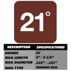 - FASTENERS: Accepts round head 21° plastic strip collated nails from 2″ up to 3-1/2″ in length and 0.113″ to 0.131″ in diameter
