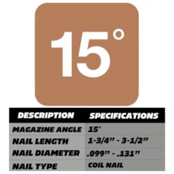 - FASTENERS: Accepts 15 degree +/- 1 wire coil nails from 1-3/4-in – 3-1/2-in