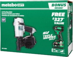 Metabo HPT introduces the new Pro Bundle 1-3/4″ Coil Roofing Nailer with BONUS Impact Driver Kit! This limited time offer includes everything a pro needs to get the job done. This bundle includes our Pro Preferred Coil Roofing Nailer, 18V Cordless Triple Hammer Bolt Impact Driver (WH18DCQ4), 18V/36V MultiVolt 5.0Ah Water & Dust Resistant Battery (380083M), and charger. The Coil Roofing Nailer (NV45AB2), is extremely lightweight, (only 5.7 Lb.) making it the essential tool for the fast-pace working environment. It features rapid driving and unprecedented quick response with unique cylinder valve firing mechanism allowing you to fire up to 3 nails per second. The Coil Roofing Nailer will fire all standard Roofing Nails ranging in size from 7/8 In. to 1-3/4 In. Its depth of drive adjustment will allow the user to drive the nail to the desired depth at operating pressure ranging from 70 to 120 psi. Also included in this pro bundle kit is the BONUS Metabo HPT 18V MultiVolt Cordless Triple Hammer BOLT Impact Driver model (WH18DCQ4). This next generation cordless Triple Hammer impact, provides an innovative solution to make any jobsite even more productive! By incorporating a third anvil and now 5 speed settings including the powerful BOLT mode that efficiently tightens and loosens large bolts and nuts, it can achieve a high torque of 1,859 in-lbs, an impressive 4,000 BPM, and a faster driving speed of 3,700 RPM, while also reducing vibration. This impact driver is ultra-compact at only 4.5″ in length allowing users to have more access in tight spaces and at only 2.0lbs, it is lightweight to use all day. With its Triple LED light, it is perfect to work in any dark workspace, while minimizing shadows. The tool body is IP56 rated, adding protection against dust and water exposure to ensure that the Triple Hammer BOLT Impact Driver will GO all day on any job. Also included is the BONUS charger and 18V/36V MultiVolt Water & Impact Resistant Battery (Model: 380083M) which is the next generation of Metabo HPT high power MultiVolt battery technology to fuel our expanding line of 18V & 36V tools. For better defense against moisture related short circuiting, a waterproof barrier exists for the internal cell terminals and twin exit ports for water that gets inside the battery pack. To lessen damage from drops and rough use on the job site, an impact resistant protective layer provides 15% more shock absorption and a longer battery life than previous models. It has a 5.0Ah capacity when used with 18V tools and 2.5Ah capacity when used with 36V tools and features a battery fuel gauge for user convenience. The innovative design of this MultiVolt battery helps prevent overheating when pushed to the limit, and works at temperatures as low as 14°F (-10°C).