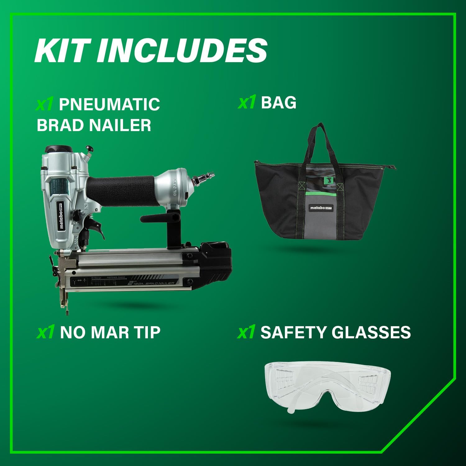 - METABO HPT BRAD NAILER: 18-gauge brad nailer for professionals who require precision, power and performance. This power brad nailer kit includes: NT50A5 Brad Nailer, Tool Bag, Safety Glasses, No-Mar Tip.