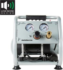 The EC28M Quiet Air Compressor is the first in a Low Noise Series from Metabo HPT that produces just 59dBs of sound so quiet that a normal conversation can be easily heard while the compressor is cycling nearby. It features an industrial oil-free pump for high durability with low maintenance, and a 2. 8 Amp direct drive induction motor for longer life. The motor is protected by an overload protection circuit that cuts off power in the case of an overload situation. Extremely compact and weighing just 25. 2 lbs, the EC28M has an ergonomically shaped rubber carrying handle to make it easier to transport around any jobsite. The steel roll cage design protects the factory installed universal quick coupler and steel encased industrial gauges. This quiet compressor has zero set up time, and is ready to go straight out of the box.