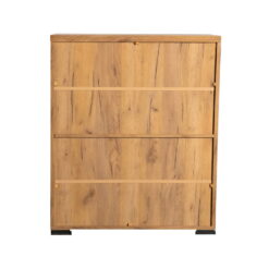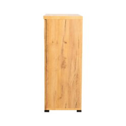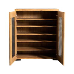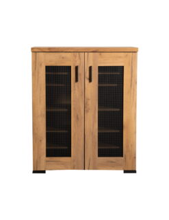 Organize your shoe collection inside this two-door rustic style shoe cabinet. The golden oak finish creates an attractive appeal in entryways and mudrooms. The gunmetal mesh door panels make for a striking contrast. Sleek bar pulls match the block style feet. Use this piece for your shoes or general storage needs.