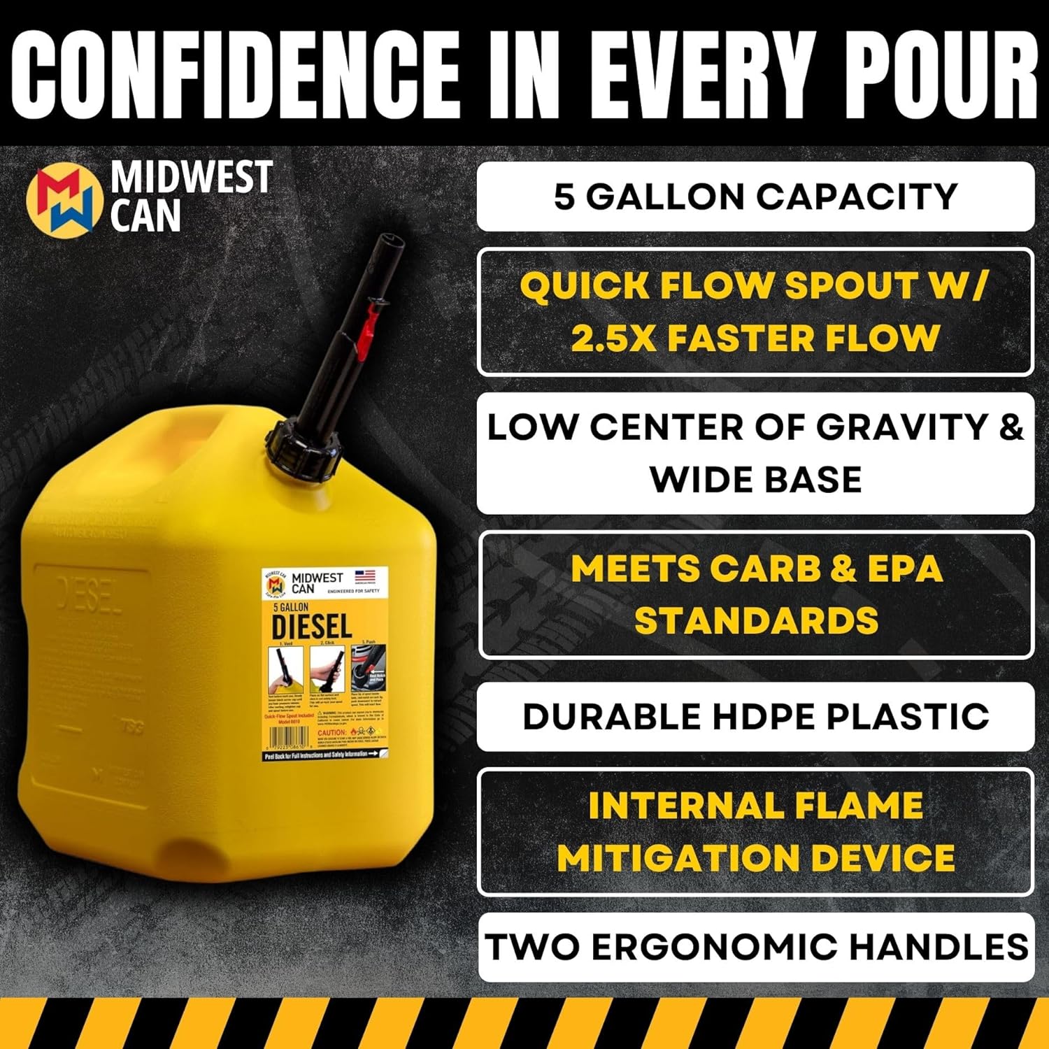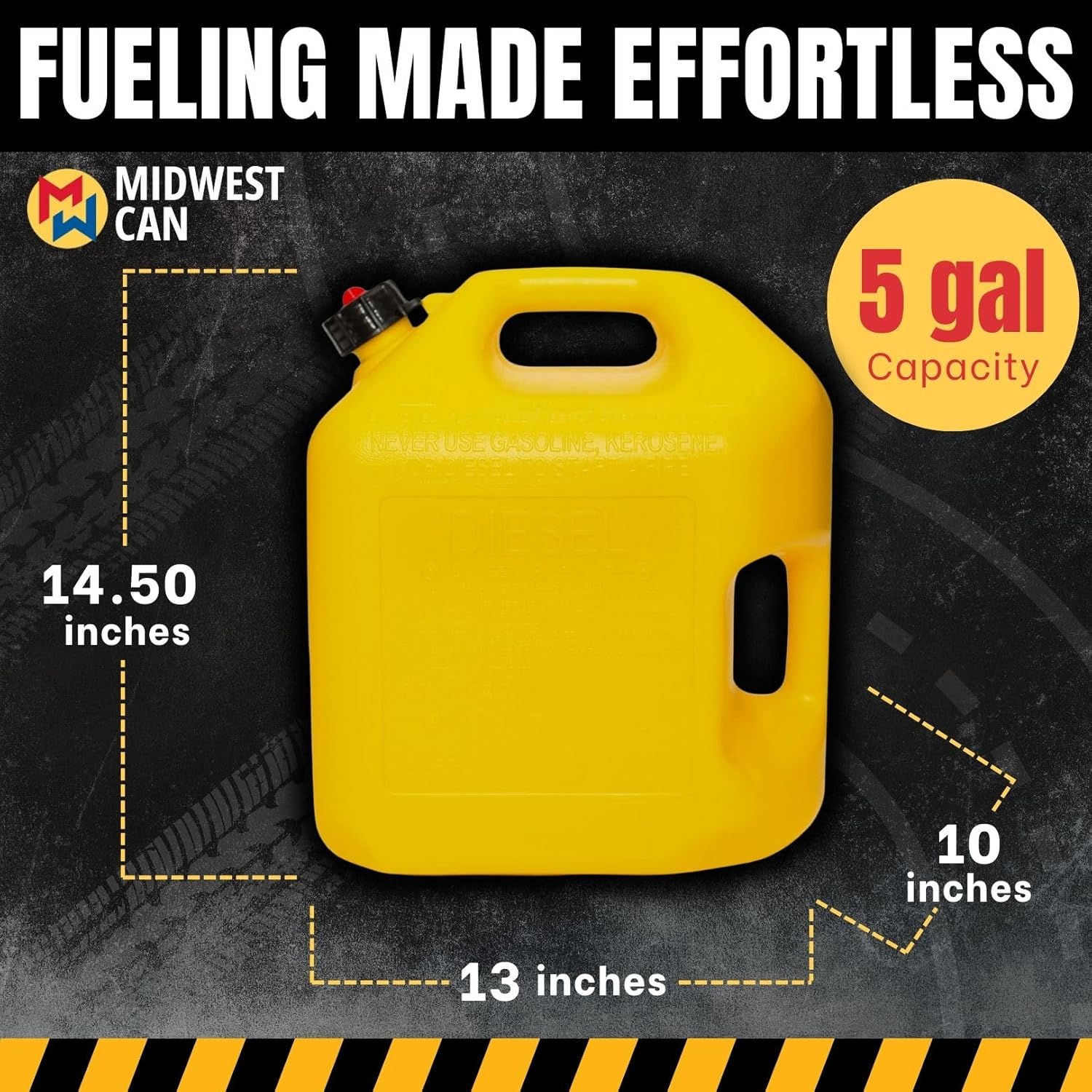 Midwest Can 8610 Safe-Flo Auto Shut Off 5 Gallon Diesel Can Yellow Plastic Fuel Container with FlameShield Safety System & Quick-Flow Spout – 1 Pack