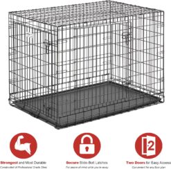- Double door heavy-duty folding metal dog crate | Includes free divider panel, leak-proof plastic pan, a strong carrying handle, rubber feet to protect floors