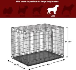 - MidWest’s Strongest Dog Crate: Product dimensions – 43” L x 28.5” W x 31.5” H | Weight – 59 lbs. | For dogs with a weight between – 71 to 90 lbs.