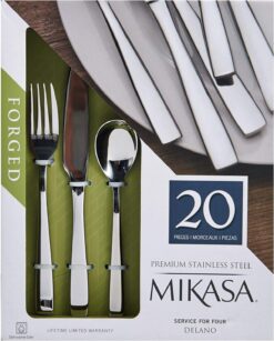 This Delano 20-Piece Flatware Set by Mikasa features a sleek, contemporary design, with gently curved handles that go from narrow at the neck to wide at the square-cut tips. The polished finish provides a lustrous sheen that complements any dinnerware or stemware, and is ideal for either casual or formal dining. Constructed of superior quality 18/0 forged stainless steel to stand up to the rigors of everyday use, these pieces never need polishing. 20-piece set, service for 4, includes 4 each of: dinner fork, dinner spoon, dinner knife, salad fork, and teaspoon. Dishwasher safe