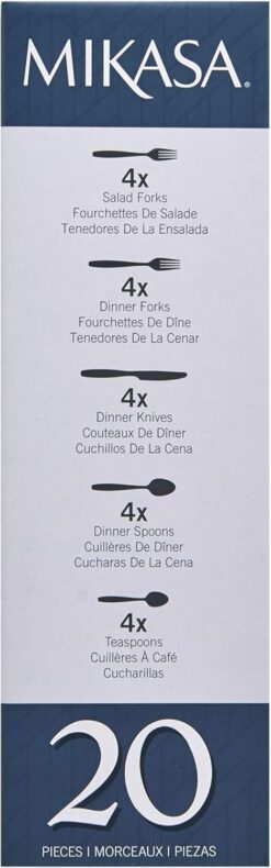 - 20-PIECE SET: includes 4 each of: dinner fork, salad fork, dinner knife, dinner spoon, and teaspoon