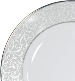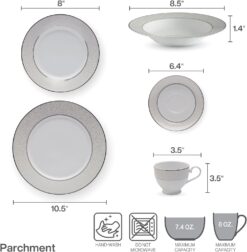 Elevate your tabletop display with this Parchment 40-piece Dinnerware Set by Mikasa. Crafted of high-quality porcelain, the crisp white pieces in this collection are bordered with a graceful silvery scroll design on a soft gray background framed by a platinum border. The timeless appeal of this striking pattern brings a sophisticated and refined look to your tabletop and stunningly complements your flatware and stemware. Hand-washing recommended to extend the life of the pattern.